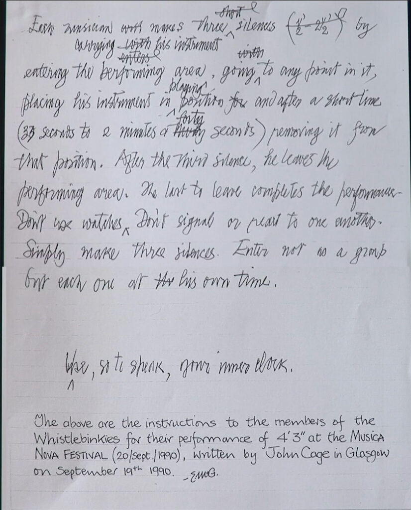 - What silence taught John Cage: The story of 4′ 33″ (2009). This is an essay about Cage’s encounter with silence and how to understand the silent piece in this context. Written for the catalog of the Cage retrospective show at Museu d’Art Contemporani de Barcelona.